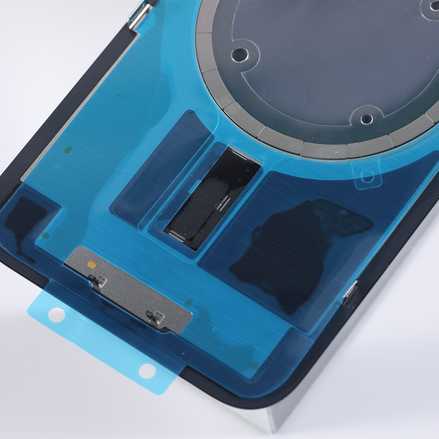 🔧 Capac spate din sticlă pentru iPhone 14, turnat dintr-o singură bucată pentru o potrivire perfectă. Include magneții pentru MagSafe integrați, dar nu include modulul NFC – acesta trebuie transferat de pe capacul original.